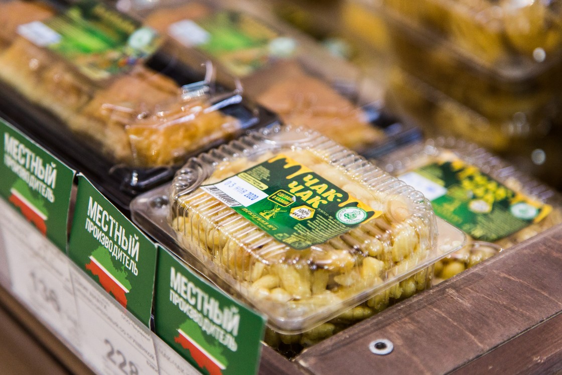На полках уже представлен чак-чак и другие медово-ореховые лакомства, производимые в Татарстане. И, конечно, любимец всех татарстанцев — эчпочмак с уткой или говядиной. В классическом исполнении от местных поставщиков в ассортименте появились также манты с говядиной и вареники с картошкой от ООО «ТЮБЕТЕЙ УК», филе утиной грудки от СХПК «КАУСАР».