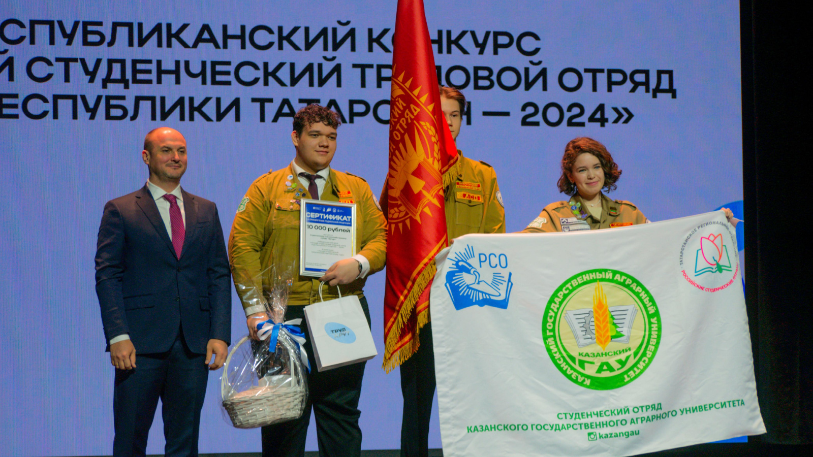 Заместитель министра наградил победителей конкурса в номинации «Лучший сельскохозяйственный студенческий отряд»: студенческий путинный отряд «Наутилус» на базе Казанской государственной академии ветеринарной медицины им. Н.Э. Баумана и студенческий сельскохозяйственной отряд «Батыр» на базе Казанского государственного аграрного университета.