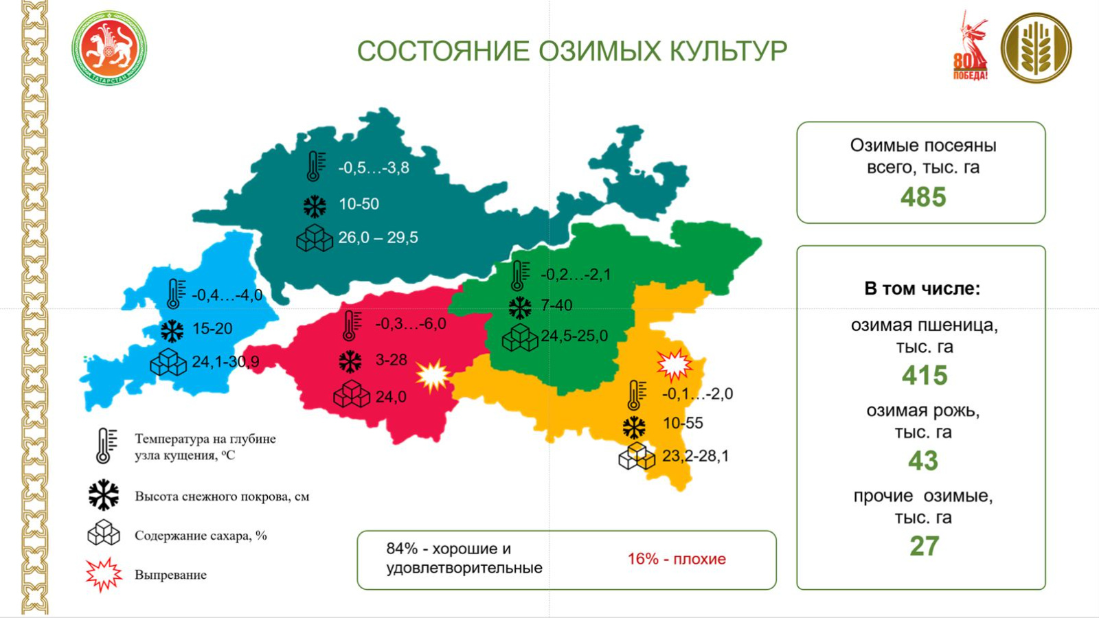 На сегодня состояние озимых оценивается как хорошее и удовлетворительное, гибель отобранных образцов на проращивание составляет от 1% до 4%.