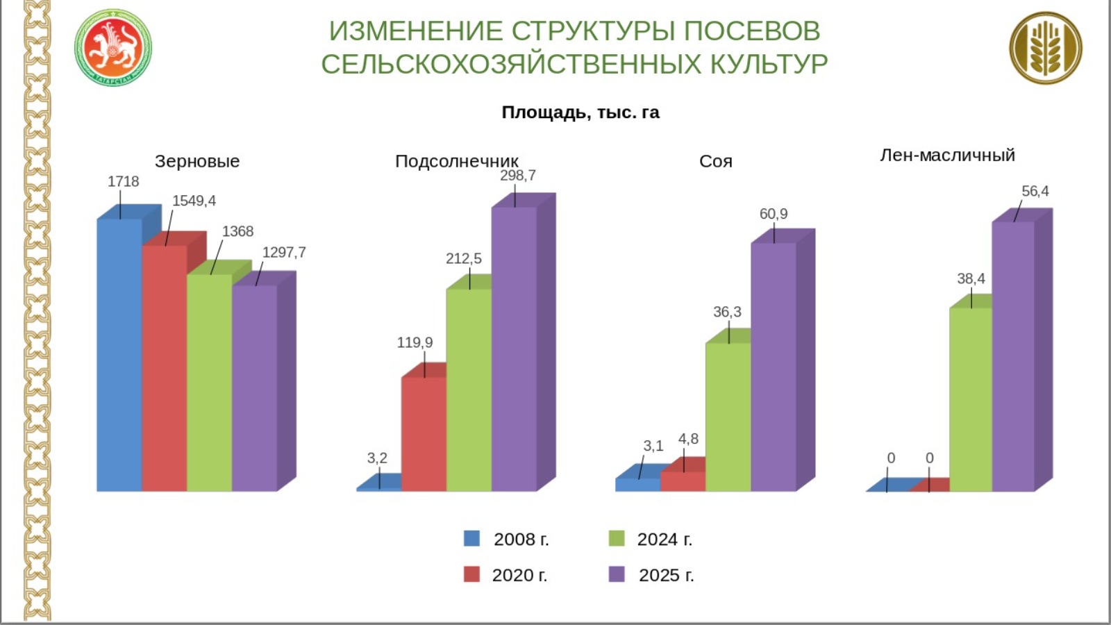 В текущем году - по сравнению с 2024 годом - зерновые культуры уменьшились на 70 тыс. га и составили 1298 тыс. га, технические культуры увеличилась на 97 тыс. га, в том числе площади подсолнечника сегодня составляют 298,7 тыс. га, сои - 60,9 тыс. га, льна масличного -56,4 тыс. га.