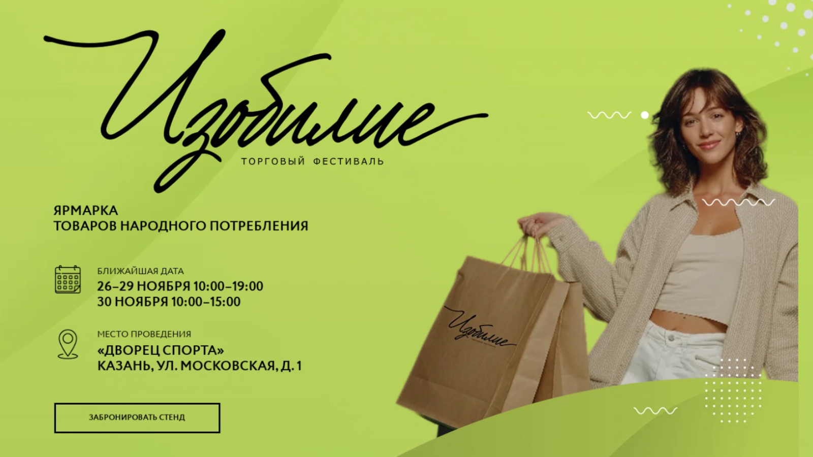 С 26 по 30 ноября 2025 года в фойе Дворца спорта в Казани по адресу: ул. Московская, д.1 пройдет ежемесячная выставка-ярмарка товаров народного потребления — татарстанский торговый фестиваль «Изобилие».