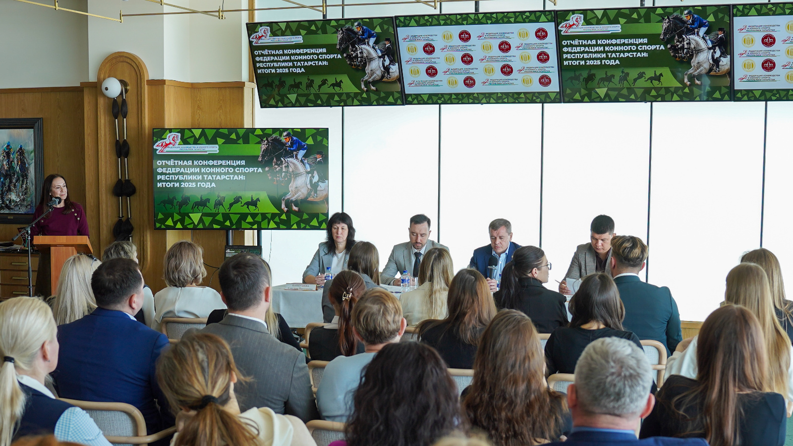 Светлана Каппушева «Татарстан Республикасы Ат спорты федерациясе» төбәк иҗтимагый оешмасының 2025 елдагы эшенә йомгаклар турындагы нотык белән чыгыш ясады. Бүгенге көндә безнең Ат спорты федерациясендә 72 кеше исәпләнә. Республика территориясендә 9 ат спорты мәктәбе һәм 11 клуб уңышлы эшләп килә. 2025 елда 34 чара уздырылды, шулардан 17 турнир төбәк дәрәҗәсеннән алып Бөтенроссия дәрәҗәсендәге статуска ия булды», - диде ул.